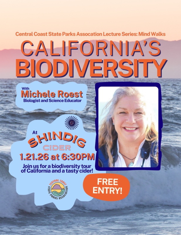 About the Presenter: Michele Roest grew up in San Luis Obispo, where her father taught in the biology department at Cal Poly. Michele followed in her father’s footsteps and became a vertebrate ecologist, with a focus on marine mammals. She has an MS in Biology and an MFA in Creative Writing. Michele served as an education specialist for the Office of National Marine Sanctuaries, and coordinated the Coastal Discovery Center at San Simeon Bay for more than 10 years. Currently, Michele teaches Biodiversity of California in the Biology Department at Cal Poly and a California Naturalist certification course through Cuesta College Community Education.